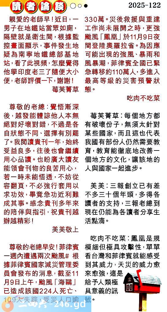 第一二二期讀者論談 1.親愛的老師早!近日,一男子在地鐵站當眾如廁隔壁就是衛生間,根據監控畫面顯示,事件發生地疑為南寧地鐵總部基地站,看了此視頻,怎麼覺得他學印度老三了隨便大小便,老師評價一下,謝謝!莓芙菁草 〖莓芙菁草〗:每個地方都有破壞份子,無須太針對某些國家,而且這也代表我國有部份人仍然需要教育,教育能徹底地改善一個地方的文化,讓該地的人與國家一起進步。 2.尊敬的老總:覺悟漸深後,越發能體諒他人本無絕對好壞對錯,不過是各自狀態不同、選擇有別罷了。我閱讀貴刊一年,始終受益良多,往後也會繼續用心品讀。也盼廣大讀友能領會刊物的良苦用心,若一時未能悟透,不妨從容翻頁,不必強行套用以求功效,畢竟急功近利難成其事。感念貴刊多年來的陪伴與指引,祝貴刊越辦越精彩!美美敬上 〖美美〗:三報創立已有差不多三十個年頭,多得各讀者的支持,三報老總到現在仍能為各讀者分享生活點滴。 3.尊敬的老總早安!菲律寶一週內遭遇兩次颱風#根據菲律賓國家減災管理委員會發布的消息,截至11月9日上午,颱風「海鷗」已造成該國224人死亡、109人失踪,受災人口逾330萬。災後救援與重建工作尚未展開之時,更強颱風「鳳凰」於11月9日夜間登陸奥羅拉省。為因應可能出現的強風、暴雨和風暴潮,菲律寶全國已緊急轉移約110萬人,多進入最高等級的災害預警狀態。吃肉不吃菜 〖吃肉不吃菜〗:鳳凰是規模細但極具攻擊性,單單看台灣和菲律賓就能感受到其威力,天災的威力愈來愈強,這是給予人類極具意義的訊號。