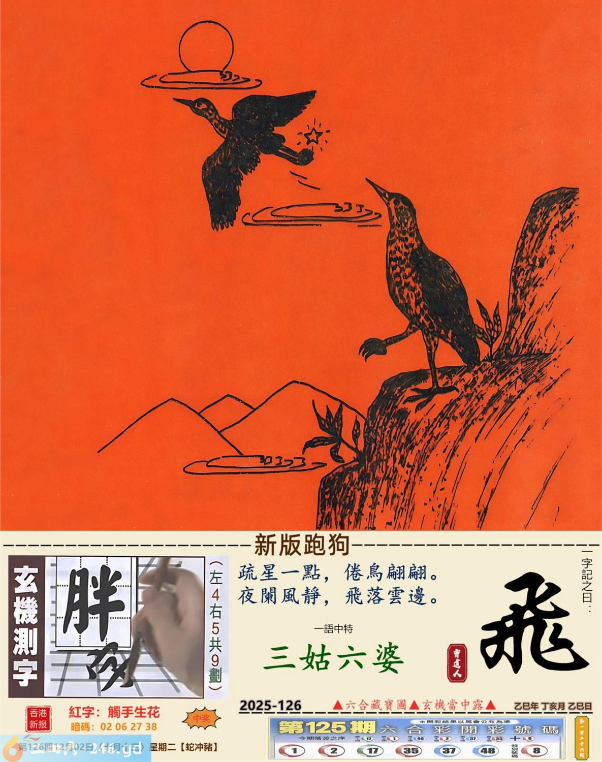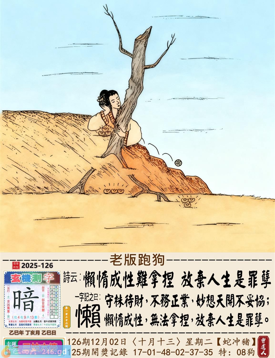 2025年11月29日126期侯(丙申)(金箔金) 126期:老版跑狗玄機一字記之曰:【懶】 詩云:懶惰成性難拿捏放棄人生是罪孽 守株待財,不務正業,妙想天開不妥協; 懶惰成性,無法拿捏,放棄人生是罪孽。 玄機測字:《暗》 密圖詩:十次買一有時中 《記》:一日文章拜布衣 特碼大小單雙句:方圓十里無客棧 今期必中:張飛 126期:特碼歇后語 掉进水里的鞭炮-----给谁都不要 126期正版四字梅花诗:龙争虎斗。 126期火车头:烧伤狗。诗:猴死龙伤,无穷二四过一边。 126期香港第一手欲钱料:大名鼎鼎? 126期曾道人说:“厨娘?” 126期另版四字梅花诗:七十二变。 126期香港第一手欲钱料:欲钱找世界最高楼。 126期曾道人说:“为什么现代的人喜欢赌博”? 126期:二字經:三九 126期:高丽参是特码 126期:智力金壤:烟雨蒙蒙 126期:信箱紅字:【觸手生花】 126期:【暗碼:02062738】 126期:一語中特:【三姑六婆】 發財玄機圖:挖空心思絞盡腦汁 圖中明狗紅藍 126期:藏寳圖 新:造化无心本不知 老:流到前溪无半语 禁:兔禁:8尾玄机字《离》 2025年126期【生活幽默】版 〖好友〗 古時候,有一個和尚跟一個屠夫是好友。 和尚早上要起來念經,而屠夫要起來殺猪。爲了不耽誤各自工作,便約定早上互相叫對方起床。 多年後和尚與屠夫去世了。屠夫去了天堂,和尚却下了地獄。因爲屠夫天天做善事,叫和尚起來念經;而和尚天天叫屠夫起來殺生。