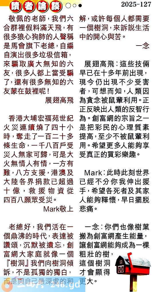 第一二七期讀者論談 1.敬佩的老師,我們六合群裡假料滿天飛,有很多狼心狗肺的人聲稱是馬會旗下老總,自編自演出很多垃圾信箱來騙取廣大無知的六友,很多人都上當受騙了,還有很多無知的六友蒙在鼓裡呢!展翅高飛 〖展翅高飛〗:這些技倆早已在十多年前出現,現今仍出現不少受害者,可想而知,人類因為貪念被鼠輩利用。正正反映出人類的反智行為。創富網的宗旨之一是把彩民的心理質素提高,至少不被鼠輩利用。希望更多人能夠享受真正的買彩樂趣。 2.厂香港大埔宏福苑世紀火災連續燒了四十小時,奪走了一百二十多條生命,一千八百戶受災人無家可歸,可是大火無情人有情,一方有難,八方支援,港澳及大陸各界捐款已超過十億,救援物資從四百八願眾受災。敬上 〖〗:此時此刻世界已經不分你我伸出援手,希望各死者及其家人能夠釋懷,早日擺脱悲痛。 3.老總好,我們活在一個鼎沸的時代,表達被讃頌,沉默被遺忘,創富網大家庭就像一個「樹洞」我們向樹洞傾訴,不是孤獨的獨白而是與自己最深處的和解,或許每個人都需要一個樹洞,來訴說生活中的開心與苦。一念 〖一念〗:你們也像樹葉搬為創富網產生能量,讓創富網能夠成為一棵粗壯的樹,這個樹洞中才會顯得更大。