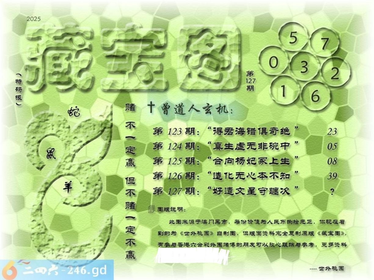 127期藏寶圖 新:好遣文星守躔次 老:毒虬相视振金环 禁:猴禁:8尾玄機字:《竺》 财爷送:“何必求神仙”