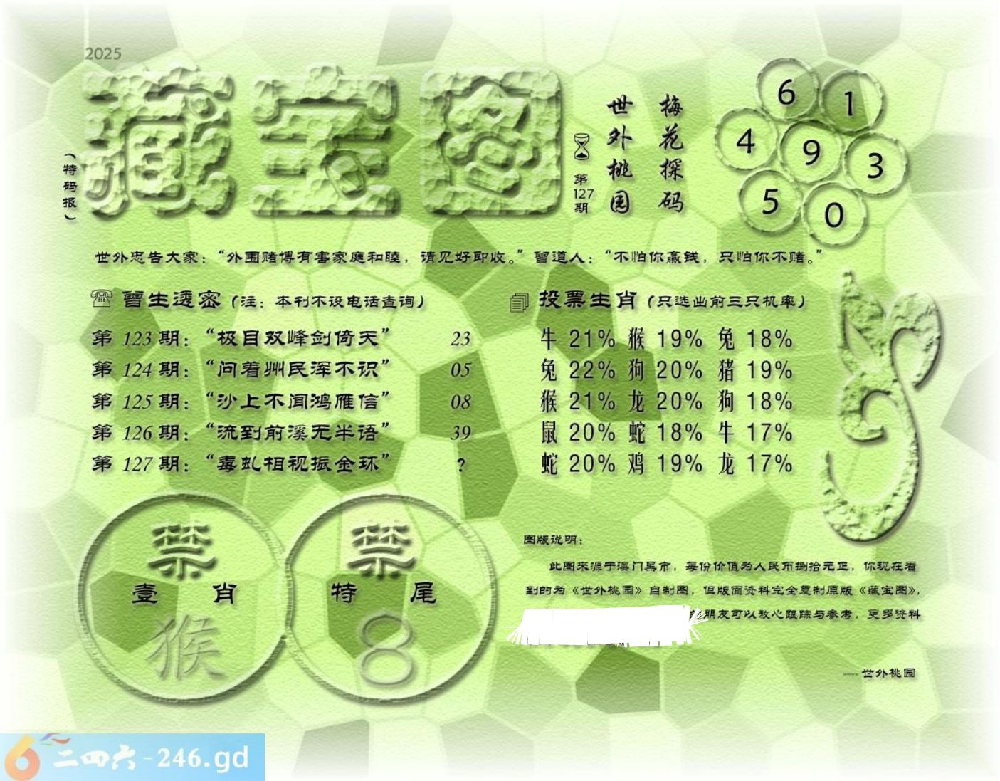 127期藏寶圖 新:好遣文星守躔次 老:毒虬相视振金环 禁:猴 禁:8尾 玄機字:《竺》财爷送:“何必求神仙”