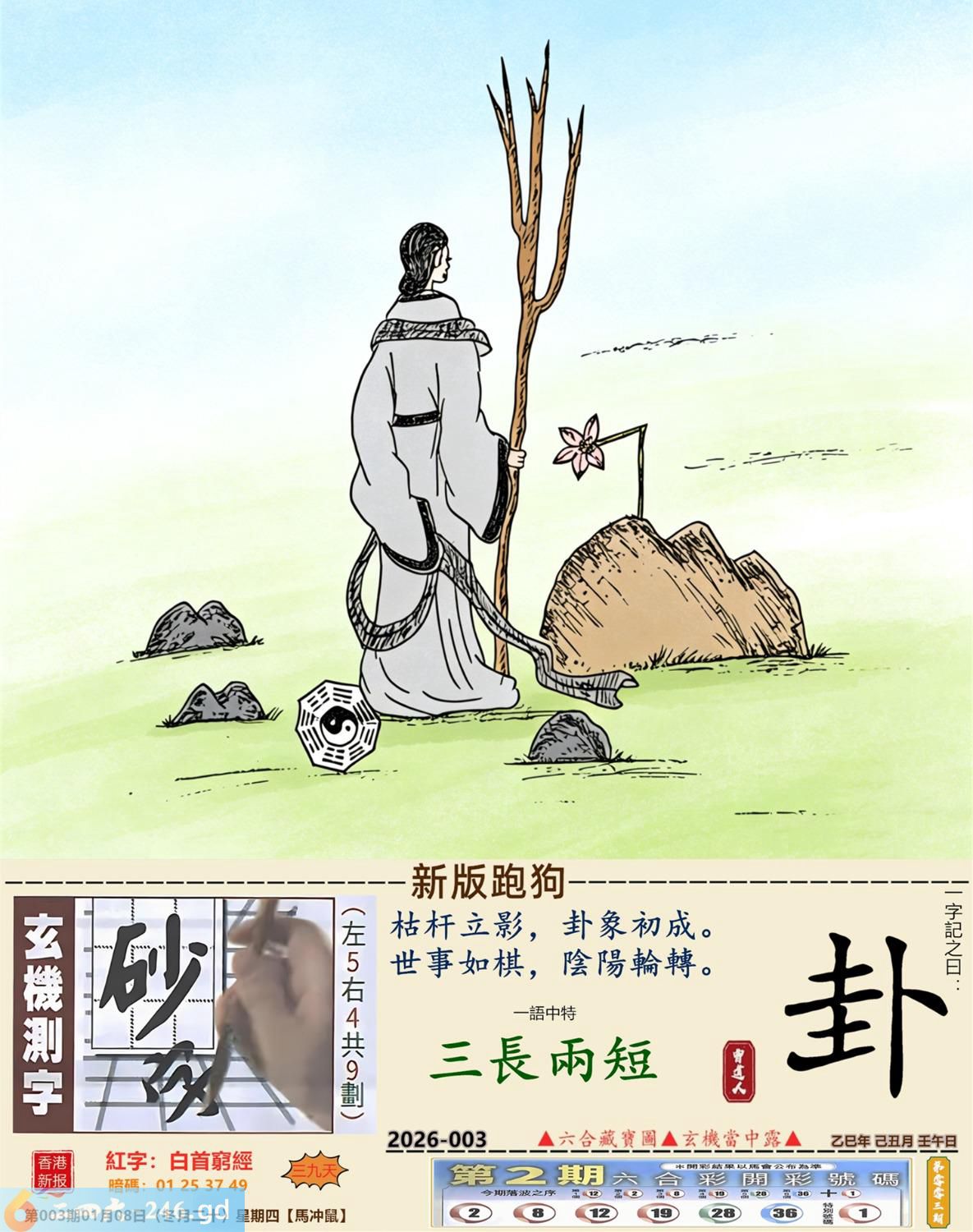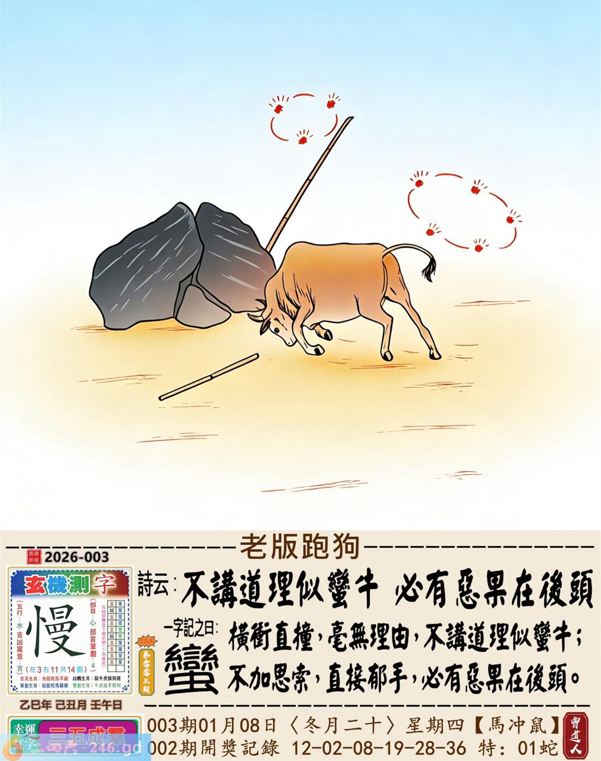 2026年1月8日003期鼠(丙子)(杨柳木) 003期:老版跑狗玄機一字記之曰:【蠻】 詩云:不講道理似蠻牛必有惡果在後頭 橫衝直撞,毫無理由,不講道理似蠻牛; 不加思索,直接郁手,必有惡果在後頭。 玄機測字:《慢》 密圖詩:一二好運伴八在 《記》:三人玩耍最開心 特碼大小單雙句:一山不能容二虎 今期必中:貂禪 003期:特碼歇后語 黑瞎子骑脖领-----熊到头上了 003期正版四字梅花诗:沉默是金。 003期火车头:烧伤羊。诗:牛死兔伤,换梁偷柱为一员。 003期香港第一手欲钱料:风吹草动。 003期曾道人说:“子” 003期另版四字梅花诗:九九归一。 003期香港第一手欲钱料:欲钱找电视机的外壳。 003期曾道人说:“为什么老鼠看见猫会害怕”? 003期:二字經:愛人 003期:头上是特码 003期:智力金壤:风花雪月 003期:信箱紅字:【白首窮經】 003期:【暗碼:01-25-37-49】 003期:一語中特:【三長兩短】 發財玄機圖:大腹便便肥頭大耳圖中明豬紅藍 003期:藏寳圖 新:君今旧隐治叁径 老:交游相见休相问 禁:狗禁:3尾玄机字《队》 2026年003期【生活幽默】版 〖照顧藏獒和鹦鹉〗 一天,老張的鄰居出遠門,要老王照顧好家裹的藏獒和鹦鹉,并且告訴他,藏獒叫老黑,你可以随便逗它玩,但是鹉绝對不能逗它。老王笑着答應了。 之後,老王逗了藏獒好久什事也没有,看到鹦鹉,心想藏獒都逗得起,那衹傻鳥怕什...于是果斷逗了鹦鹉。 鹦鹉説話了:哎我草,撩騷是不?老黑,上!咬他!......随後老王被拉進急救室......