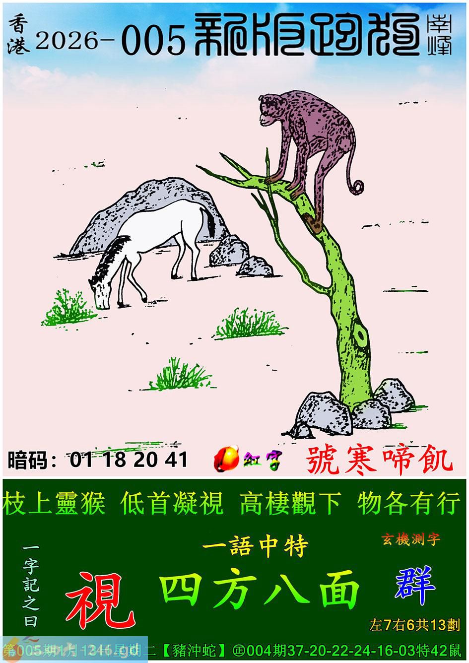 005期跑狗一字記之曰:【視】 枝上靈猴,低首凝視。 高棲觀下,物各有行。 玄機測字:《群》 一語中特:四方八面