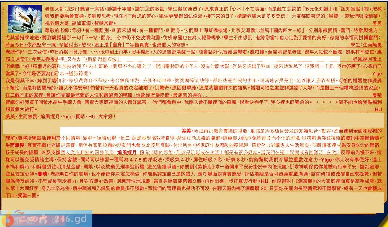 第022期《六合皇信箱文字版》10000%正確!!!正版二四六論壇*精心製作!!! 美美、生而無畏、追風逐月、、夏晴、,大家好! 【1】.老總大哥:您好!聽君一席話,勝讀十年書。讀完您的教梅,學生徹底通透了。原來真正的「心水」不在表面,而是藏在您説的「多元化知識」和「認知盲點」裡。您教導我們要融會貫通、多維度思考,現在才了解您的苦心,學生更覺得如飢似渴。接下來的日子,還請老總大哥多多登信!六友都盼著您的“墨寶”,帶我們吸收精華。祝老總大哥:福如東海,智慧常青。美美 〖美美〗:老總再説融會貫通的重要,重點是將多樣且分散的知識融合、貫穿,進而達到全面和深刻的理解。能將所學靈活運用於不同情境、從單一經驗到舉一反三,這是實現高效率自學產生、創新思維的關鍵。逭種能力能避免堕進食而不化的窘境,能夠幫助你在複雜的資訊中掌握精髓。 【2】.尊敬的老總:您好!有一種離別,叫嘉禾望崗;有一種奮鬥,叫翻身。它們與上海虹橋機場、北京安河橋北並稱「國內四大一線」,分別象徵愛情、奮鬥、詩意與遠方。尤其當搭乘地鐵,聽到廣播裡那一句「下一站,翻身」,心中仍不免波濤沟湧,彷狒命運也在為人輕聲喝彩!學生不由想到,老總您當年也必定為了愛情的美好、家庭的幸福而拼搏奮鬥;時至今日,依然堅守一線、辛勤付出。想來,這正是「翻身」二字最真實、也最動人的寫照。學生:生而無畏 〖生而無畏〗:其實不單止老總是這樣,相信有家庭負擔的朋友們也會為此義無反顧、付出所有。將家庭作為溫暖的避風港,這份努力能讓家人生活無憂,同時讓家裡成為安身立命的歸宿、孩子成長的摇篮,以及支撑個人度過難關的堅強後盾。 【3】.老總你好,三次登信,昨日終於不負所望,小小地中到土肖羊。忍手幾日,人的思維都清醒一點,晤會話好似盲頭烏蠅咐,亂咐撞。至犀利都是老總,過年大紅包不斷發,如果有幸登信,應該2月份了,今年立春後過年又春天了。時間過得真快!追風逐月敬上 〖追風逐月〗:擁有清晰的思維,無論是玩彩或在生活上都是有很多好處。當我們在遇上疑問或者困難時,在做出反應前先慢下來,這樣可以避免受情緒主導,保持客觀。閒時可以練習一種稱為4-7-8的呼吸法,深吸氣4秒、屏住呼吸7秒、呼氣8秒,能夠幫助我們冷靜並重啟注意力。 【4】.老總晚上好!這個月的衰運加持於我了。去上班路上開車不小心碰到了一個開電動車的中年人,沒有什麼大礙,就是牙齒出了點血,後來她説私了,讓我賠一千元,我也答應了。心想自己當黑了。今年是否要為自己求一道靈符呢? 〖〗:你人沒有事便好,遇上車禍和解時,和解書須註明清楚金額、期限,以及放棄民刑事追訴權,避免後續爭議。你要到《紫飾店》求一道開車平安符掛於車丙後照鏡,祈求神明保佑你駕駛時行車平安、揣災避邪,並且安定心神。 【5】.我是何其不幸,嫁到了這個家,家境贫寒且不和睦。老公無所作為,公婆不明事理,婆婆嘴碎邏缺德。都是些芝麻般的小事,可滿地皆是芝麻,足以讓人崩潰至極。可怕的婚姻並非婆婆不幫忙,而是有個攪局的,讓人不得安寧!倘若有一天我真的決定離婚了,別驚奇,原因很單純,這是我篝劃許久的結果。婚姻可怕之處並非選錯了人嫁,而是撰上一個糟糕透頂的家庭,在三觀不正的家裡,會讓你見識最骯髌的人性和最醜惡的嘴臉,也會經歷最陰暗、最痛苦的過程...夏晴 〖夏晴〗:老總明白你的處境,也不便替你決定怎樣做,你若果認定自己是嫁錯人,,應冷静靜面對真實感受,評估婚姻是否可透過重啟溝通、諮商修復或改變自己來挽救。但若關係涉及虐待、不忠或長期冷暴力,且對方無心改善,則應理性地規劃,富自身經濟能夠獨立時,再作出進一步打算與行動。 【6】.管總你好我買了個紫水晶牛手錬入會,感覺大家庭裡面的人都好属害,他們都會解中,我剛入會不懂裡面的邏輯,眼看快過年了,我心裡也挺著急的。。。。。能不能也給我點福利想買個太歲符。 〖〗:你説得對!《創富網》的大家庭裡面真是高手如雲,就以第十六期紅字:身先士卒為例,解中戰肖和先鋒狗的會員多不勝數。而我們的管理員也是功不可沒,在聊天區内補了個農暦20,只要你在網內長期留意和不斷學習,終有一天也會藝成下山、獨當一面。 紅字:乘隙搗虛 暗码:14192324 [释义]趁空子,攻虚弱。 [出处]金·王若虚《送王士衡赴举序》:“恐乘隙捣虚,瑕者毕坚,而胜负之势未可料也。”