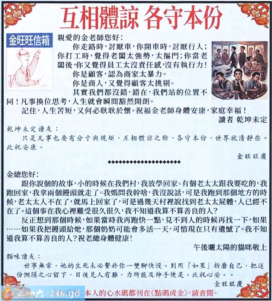 026期:金旺旺信箱彩民推荐→→《互相體諒 各守本份》