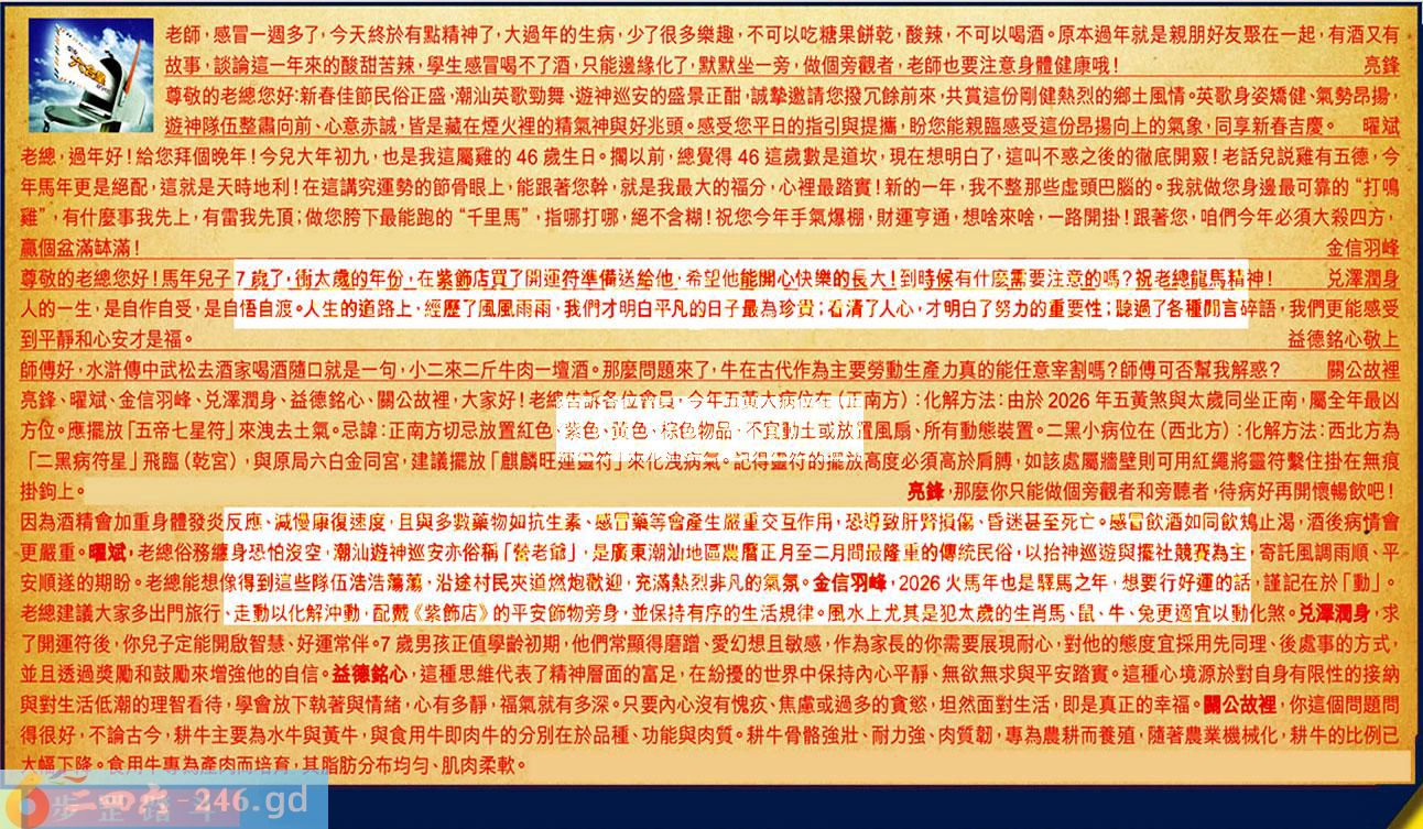 第030期《六合皇信箱文字版》10000%正確!!! 亮鋒、曜斌、金信羽峰、兑澤潤身、益德銘心、關公故裡,大家好!老總告訴各位會員,今年五黄大病位在(正南方):化解方法:由於2026年五黃煞與太歲同坐正南,屬全年最凶方位。應擺放「五帝七星符」來洩去土氣。忌諱:正南方切忌放置紅色、紫色、黄色、棕色物品,不宜動土或放置風厨、所有動態装置。二黑小病位在(西北方):化解方法:西北方為「二黑病符星」飛臨(乾宮),與原局六白金同宮,建議擺放「麒麟旺運运符」來化洩病氣。記得重符的擺放高度必須高於屑膊,如該處屬牆壁則可用紅繩將靈符繋住掛在無痕掛鉤上。 【1】.老師,感冒一週多了,今天終於有點精神了,大過年的生病,少了很多樂趣,不可以吃糖果餅乾,酸辣,不可以喝酒。原本過年就是親朋好友聚在一起,有酒又有故事,談論這一年來的酸甜苦辣,學生感冒喝不了酒,只能邊緣化了,默默坐一旁,做個旁觀者,老師也要注意身體健康哦!亮鋒 〖亮鋒〗:那麼你只能做個旁觀者和旁聽者,待病好再開懷暢飲吧!因為酒精會加重身體發炎反應、減慢康復速度,且與多數藥物如抗生素、感冒篥等會產生嚴重交互作用,恐導致肝腎損傷、昏迷甚至死亡。感冒飲酒如同飲鸩止渴,酒後病情會更嚴重。 【2】.尊敬的老總您好:新春佳節民俗正盛,潮汕英歌勁舞、遊神巡安的盛景正酣,誠摯邀請您撥冗餘前來,共賞這份剛健熱烈的郷土風情。英歌身姿矯健、氣勢昂揚,遊神隊伍整肅向前、心意赤誠,皆是藏在煙火裡的精氣神與好兆頭。感受您平日的指引與提攜,盼您能親臨感受這份昂揚向上的氣象,同享新春吉慶。曜斌 〖曜斌〗:老總俗務缠身恐怕沒空,潮汕遊神巡安亦俗稱「鰲老爺」,是廣東潮汕地區農暦正月至二月間最隆重的傳統民俗,以抬神巡遊與擺社競赛為主,寄託風調雨順、平安順遂的期盼。老總能想像得到這些隊伍浩浩蕩蕩,沿途村民夾道燃炮歡迎,充滿熱烈非凡的氣氛。 【3】.老總,過年好!給您拜個晚年!今兒大年初九,也是我這屬雅的46歲生日。擱以前,總覺得46這歳數是道坎,現在想明白了,這叫不惑之後的徹底開竅!老話兒説難有五德,今年馬年更是絕配,這就是天時地利!在這講究運勢的節骨眼上,能跟著您幹,就是我最大的福分,心裡最踏實!新的一年,我不整那些虚頭巴腦的。我就做您身邊最可靠的“打鳴雞”,有什麼事我先上,有雷我先頂;做您胯下最能跑的“千里馬”,指哪打哪,絕不含糊!祝您今年手氣爆棚,財運亨通,想啥來啥,一路開掛!跟著您,咱們今年必須大殺四方,赢個盆滿缽滿!金信羽峰 〖金信羽峰〗:2026火馬年也是驛馬之年,想要行好運的話,謹記在於「動」。老總建議大家多出門旅行、走動以化解沖動,配费《紫飾店》的平安飾物旁身,並保持有序的生活規律。風水上尤其是犯太歲的生肖馬、鼠、牛、免更適宜以動化煞。 【4】.尊敬的老總您好!馬年兒子7歳了,衝太成的年份,在紫飾店買了開運符準備送給他,希望他能開心快樂的長大!到時候有什麼需要注意的嗎?祝老總龍馬精神!兑澤潤身 〖兑澤潤身〗:求了開運符後,你兒子定能開啟智慧、好運常伴。7歲男孩正值學齡初期,他們常顯得磨蹭、愛幻想且敏感,作為家長的你需要展現耐心,對他的態度宜採用先同理、後處事的方式,並且透過獎勵和鼓勵來增強他的自信。 【5】.人的一生,是自作自受,是自悟自渡。人生的道路上。經歴了風風雨雨,我們才明白平凡的日子最為珍貴;看清了人心,才明白了努力的重要性;聼過了各種閒言碎語,我們更能感受到平静靜和心安才是福。益德銘心敬上 〖益德銘心〗:這種思維代表了精神層面的富足,在紛擾的世界中保持內心平静、無欲無求與平安踏實。這種心境源於對自身有限性的接納與對生活低潮的理智看待,學會放下執著與情緒,心有多靜,福氣就有多深。只要內心沒有愧疚、焦慮或過多的貪慾,坦然面對生活,即是真正的幸福。 【6】.師傅好,水浒傅中武松去酒家喝酒隨口就是一句,小二來二斤牛肉一壇酒。那麼問題來了,牛在古代作為主要勞動生產力真的能任意宰割嗎?師傅可否幫我解惑?關公故裡 〖關公故裡〗:你這個問題問得很好,不論古今,耕牛主要為水牛與黄牛,與食用牛即肉牛的分別在於品種、功能與肉質。耕牛骨骼強壯、耐力強、肉質韌,專為農耕而養殖,隨著農業機械化,耕牛的比例已大幅下降。食用牛專為產肉而培育,其脂肪分布均匀、肌肉柔軟。 紅字:步罡踏斗 暗码:01283645 [释义]是道士礼拜星宿召遣神灵的一种动作。 [出处]《三国演义》第一三回:“[孔明]日则计议军机,夜则步罡踏斗。”