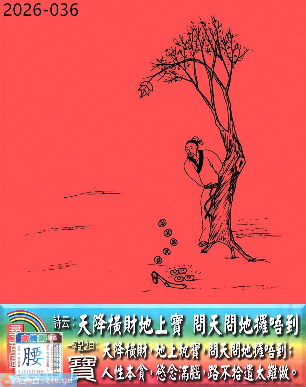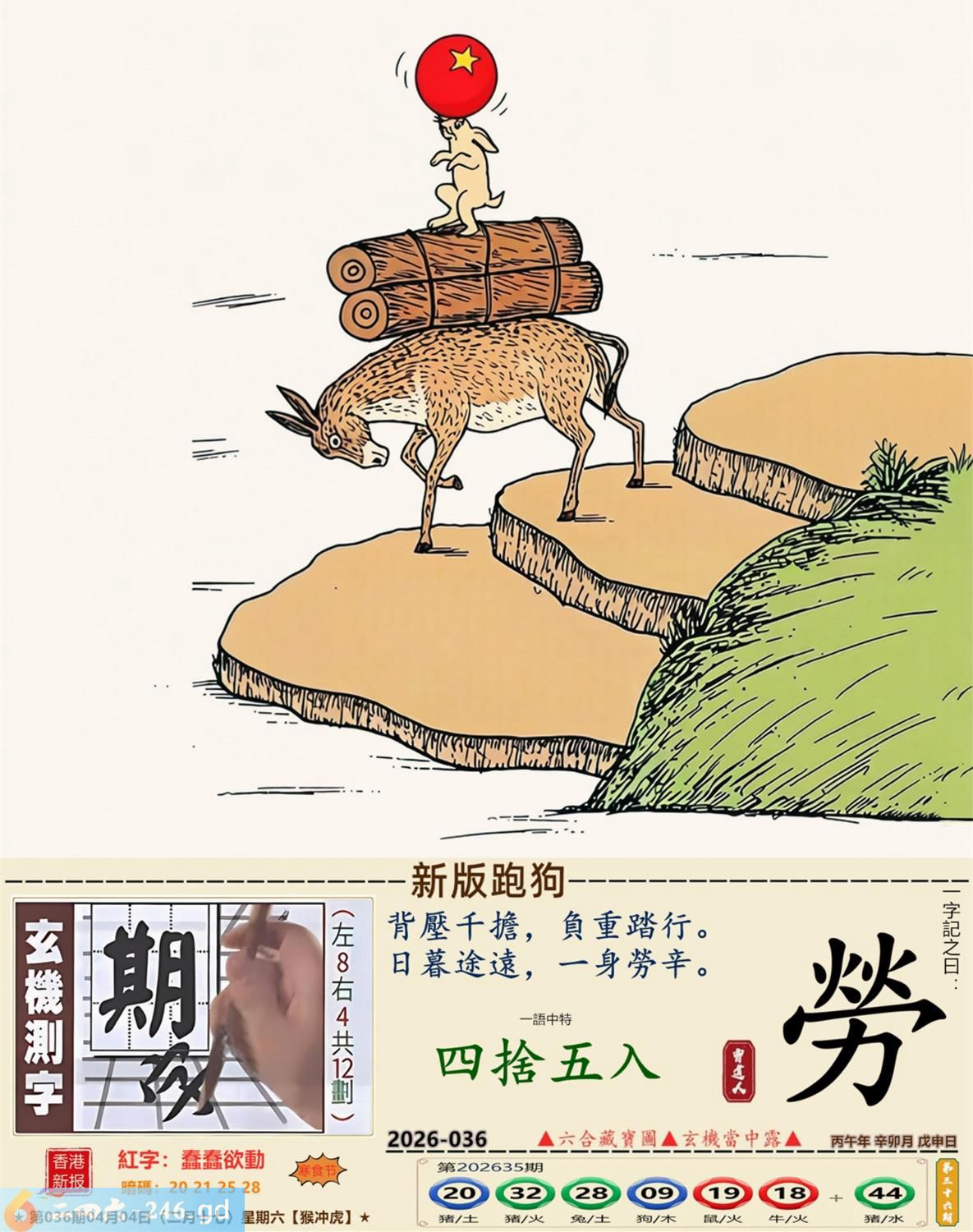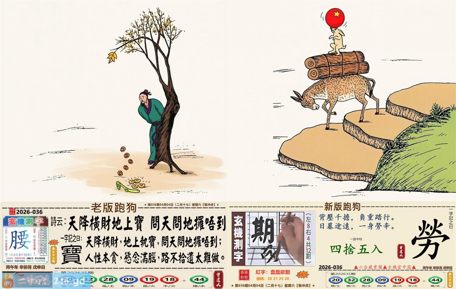 2026年4月4日二月十七星期六大驿土猴日冲虎 036期:老版跑狗玄機一字記之曰:【寶】 詩云:天降橫財地上寶,問天問地擺唔到。 天降橫財,地上執寶,問天問地擺唔到; 人性本貪,念滿腦,路不拾遺太難做。 玄機測字:《腰》 密圖詩:打開大門迎財神 記:八仙過海顯蛇兔 特碼大小單雙句:天涯海角 今期必中:劉協 036期:特碼歇后語 能字添四点-----熊样 036期正版四字梅花诗:四月四日。 036期火车头:烧伤马。诗:虎死鸡伤,三九看数一味真。 036期香港第一手欲钱料:闻鸡起舞。 036期曾道人说:“大?” 036期另版四字梅花诗:一个和尚。 036期香港第一手欲钱料:欲钱看脚小头大的动物。 036期曾道人说:“为什么女人疯狂的时候像头狼”? 036期二字经:绿红。 036期:五叶神是特码 036期智力金壤:天昏地暗 036期信箱紅字:【鍥而不舍】 036期【暗碼:16-19-20-47】 036期一語中特:【四捨五入】 發財玄機圖:交替運動節拍連續圖中明馬藍綠 036期:藏寳圖 新:西第将军成底事 老:剑花秋莲光出匣 禁:龙禁:2尾玄机字《部》 2026年036期【生活幽默】版 〖謹遵遺言的孩子〗 爺爺在病危之際,將年少無知的孫子叫到床前,用盡最後一口氣囑咐道:“孩子啊,這個世道......做官才好啊!” 小孫子是個聽話的孩子,他將爺爺臨終前的話牢牢記在心裏。許多年以後,他終于成了村裹最好的棺材匠。