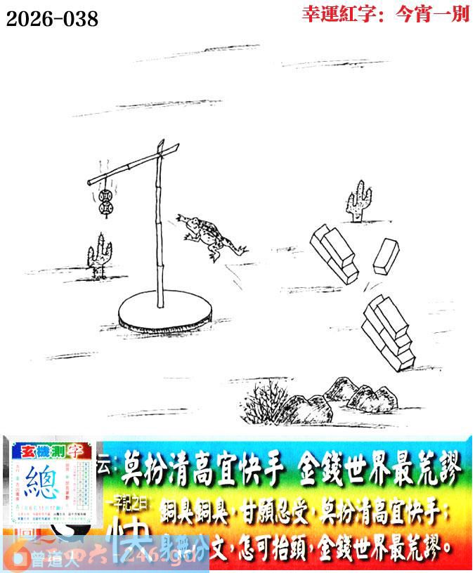 038期老版跑狗一字記之曰:【快】 詩雲:莫扮清高宜快手,金錢世界最最荒謬。 銅臭銅臭,甘願忍受,莫扮清高宜快手; 身無分文,怎可抬頭,金錢世界最最荒謬。 玄機測字:《總》