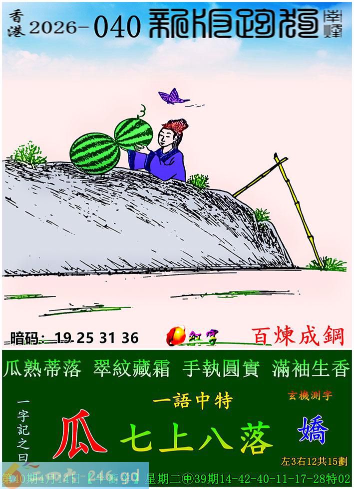 040期跑狗一字記之曰:【瓜】 瓜熟蒂落,翠紋藏霜。 手執圓實,滿袖生香。 玄機測字:《嬌》 一語中特:七上八落